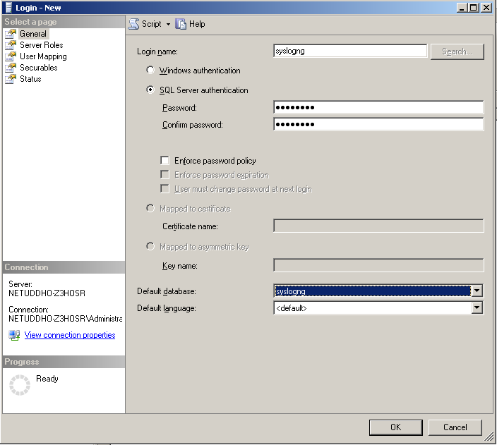 Select User Mapping. In the Users mapped to this login option, check the line corresponding to the new login (for example, syslogng). In the Database role membership field, check the db_owner and public options.