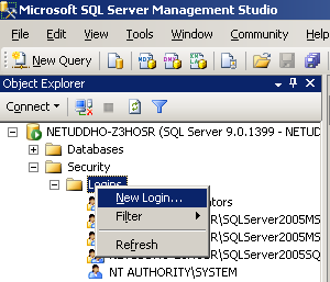 In the Object Explorer, select Security, right-click on the Logins entry, then select New Login.